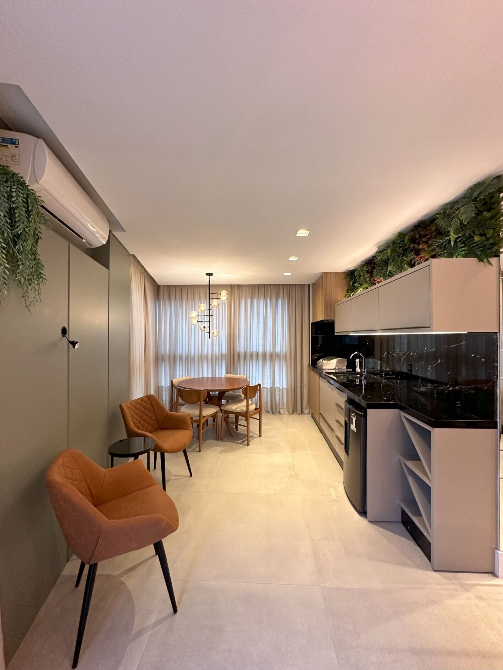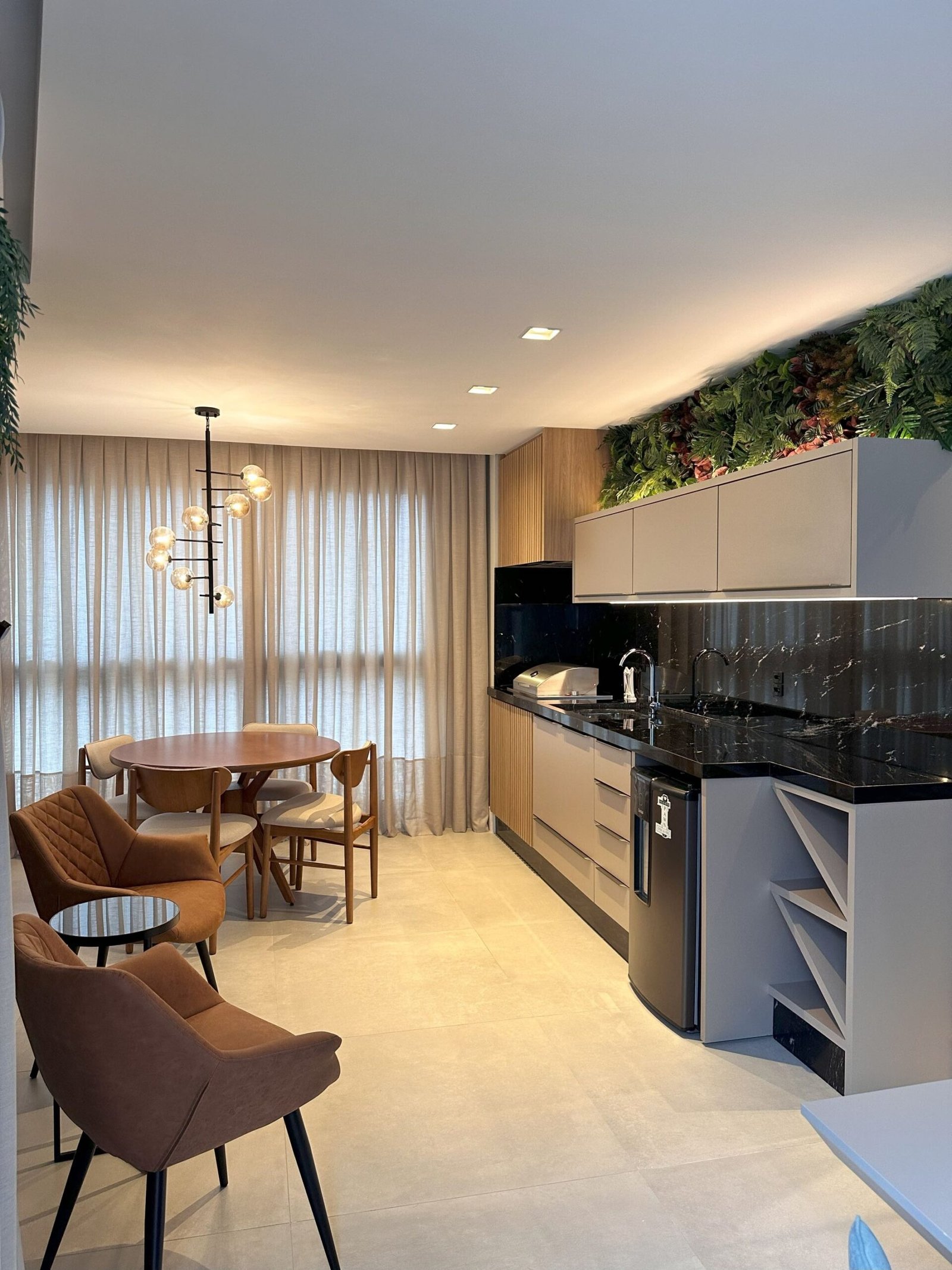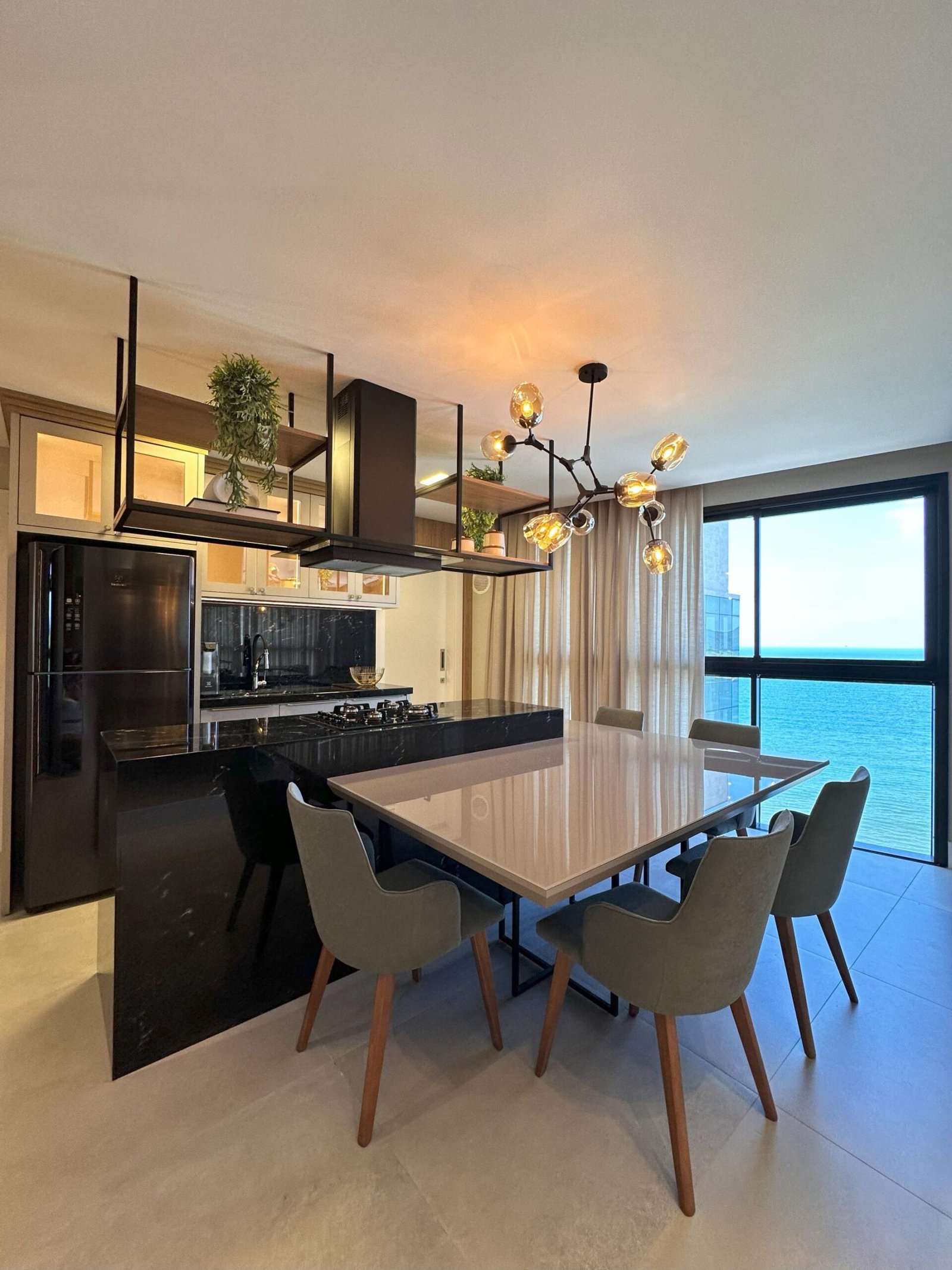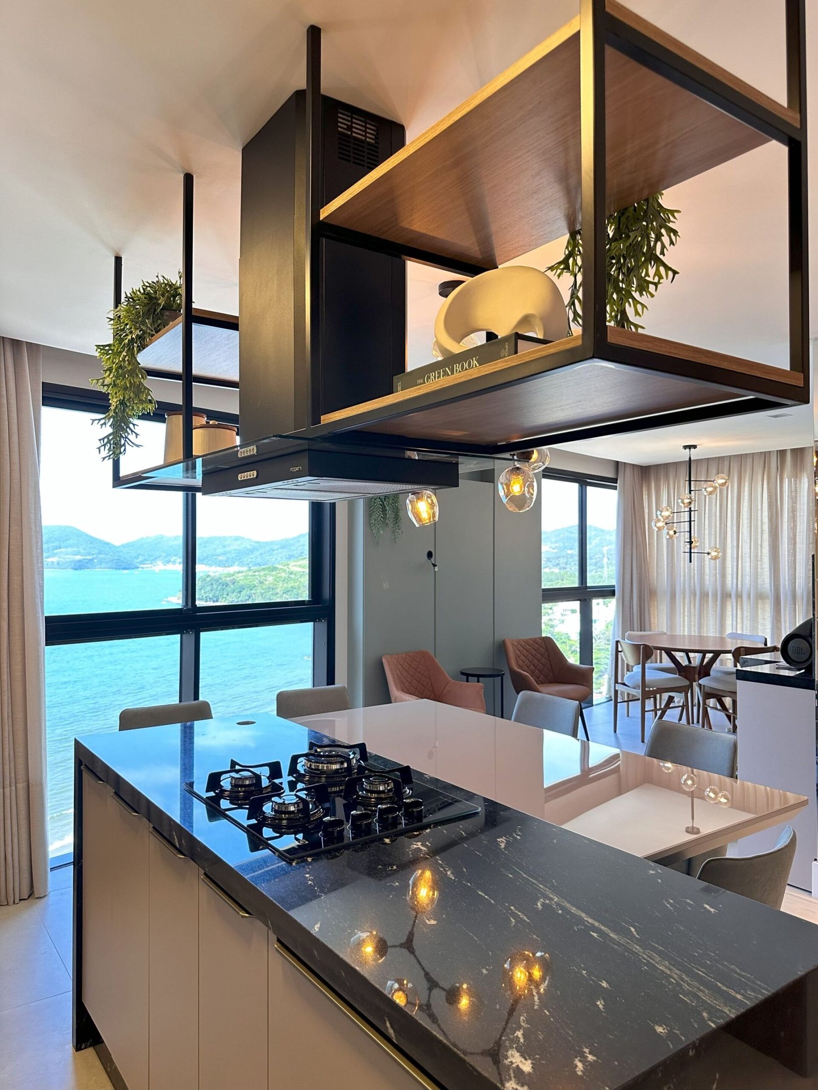 Para este projeto foi adotado um estilo moderno, trazendo aconchego através do amadeirado e uma decoração com objetos e cores que remetem à natureza dentro dos ambientes. Trata-se de um frente mar compacto, mas que possui tudo o que precisa para não deixar de ser funcional e lindo.