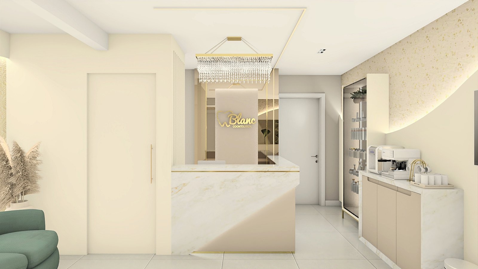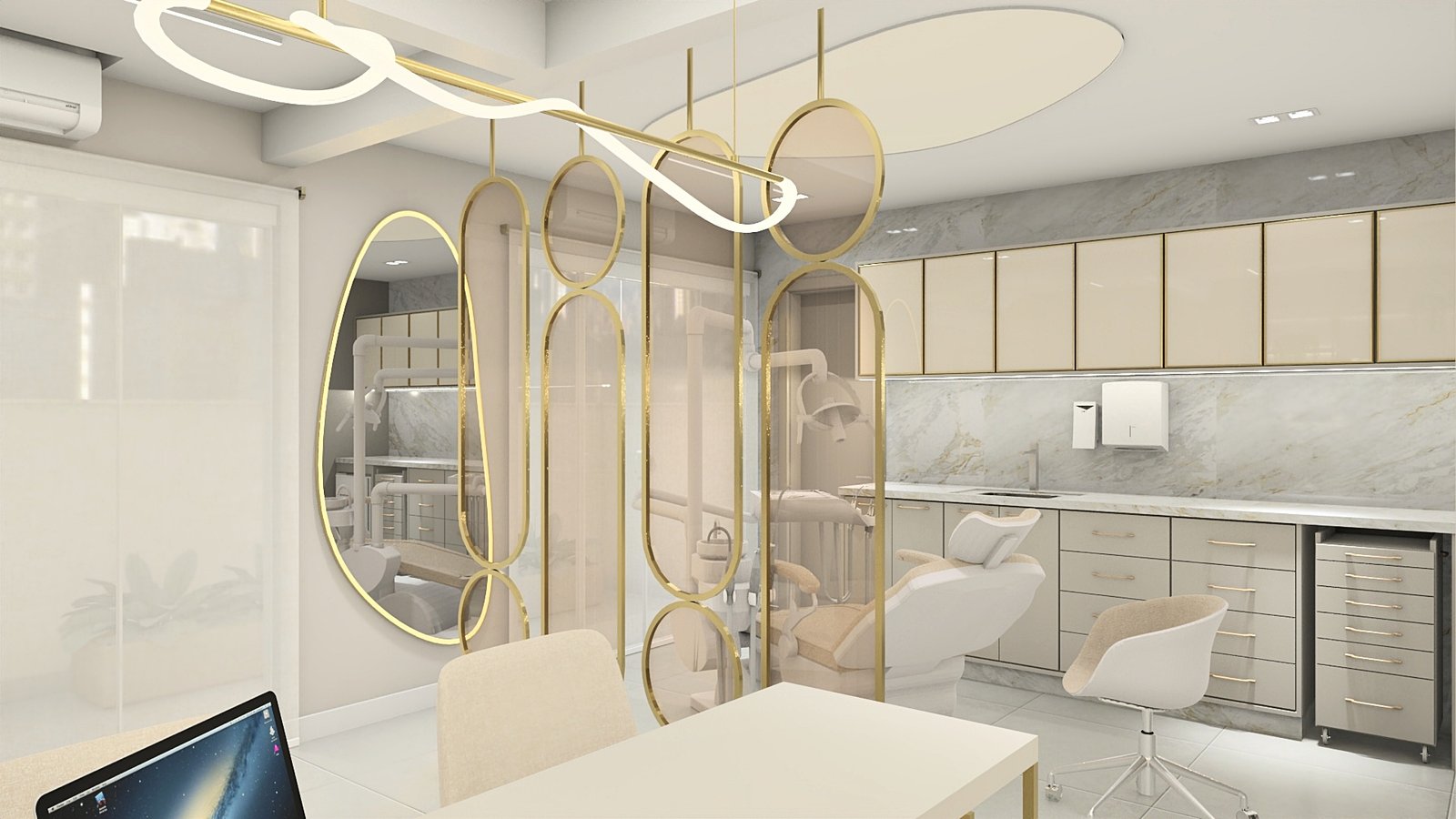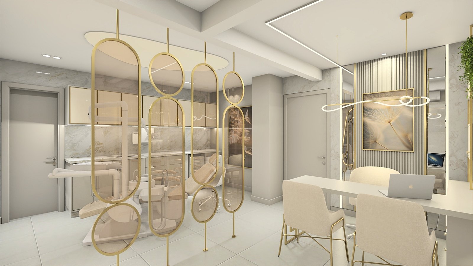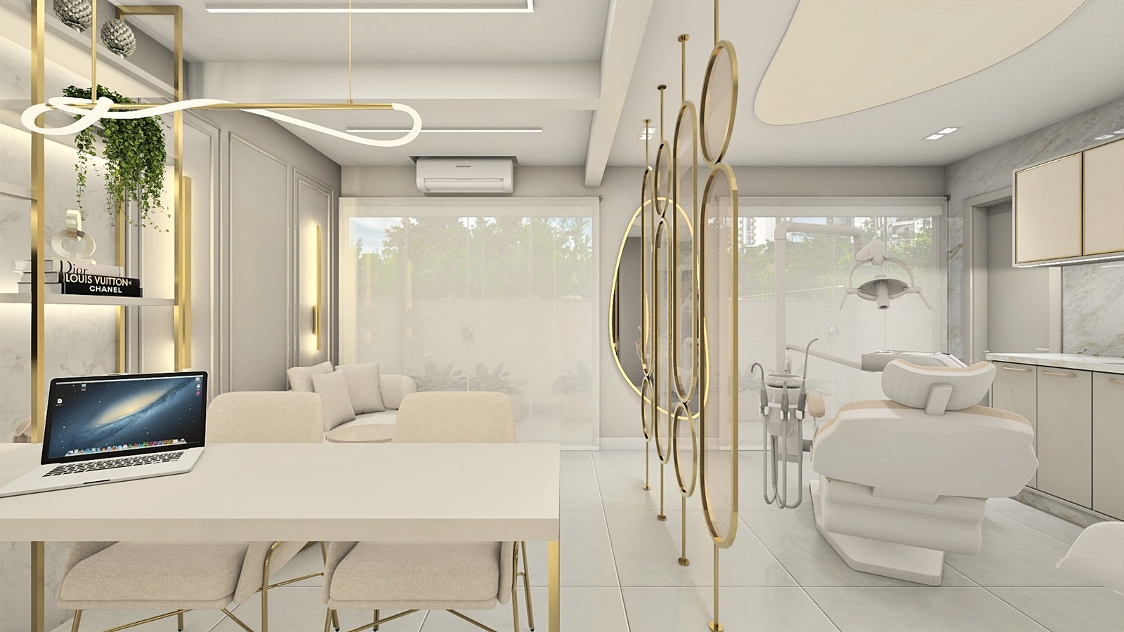 A cliente apresentou como desejo uma clínica clean e sofisticada, sem exageros. Então, partindo desse princípio, criou-se um espaço leve, aconchegante e muito receptivo, através de tons neutros, iluminação de destaque com fita de led em pontos estratégicos para evidenciarmos alguns elementos, e metais dourados para trazer o requinte que foi solicitado. Na recepção foram adotadas as formas curvas em vários pontos, a fim de trazer leveza e transformar esse ambiente de espera em um lugar que transmite tranquilidade. Um cantinho instagramável foi elaborado a pedido da cliente, com um lindo sofá verde para conferir cor com elegância à composição. Dentro do consultório, temos uma atmosfera leve através das cores e acabamentos utilizados. Acima da cadeira odontológica, a tela tensionada promove uma iluminação difusa, clara e confortável aos olhos. Destaque para as divisórias em metal dourado e vidro reflecta que delimitam os espaços. Temos então, um lindo espaço, próprio para receber seus pacientes da melhor forma possível.