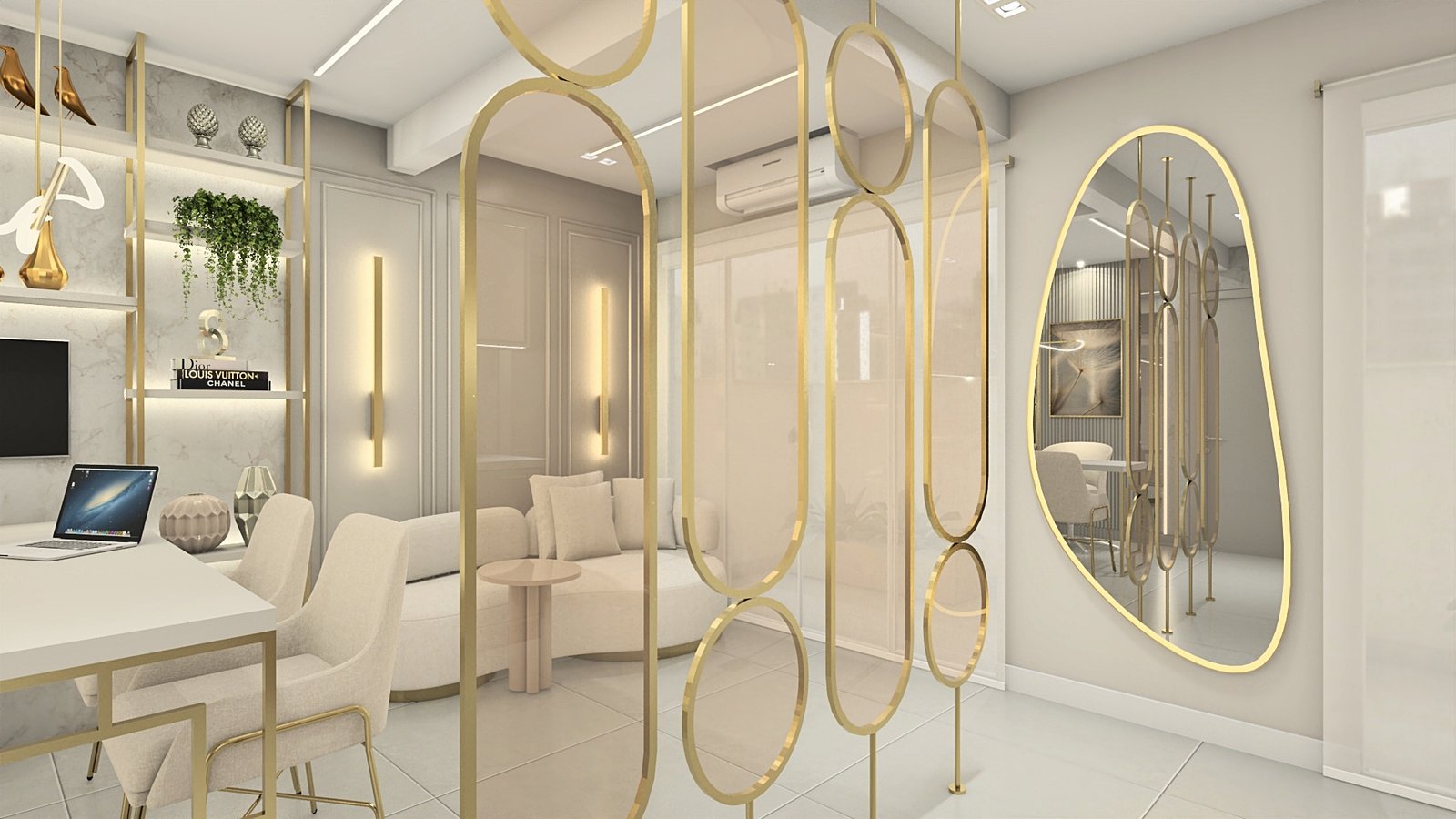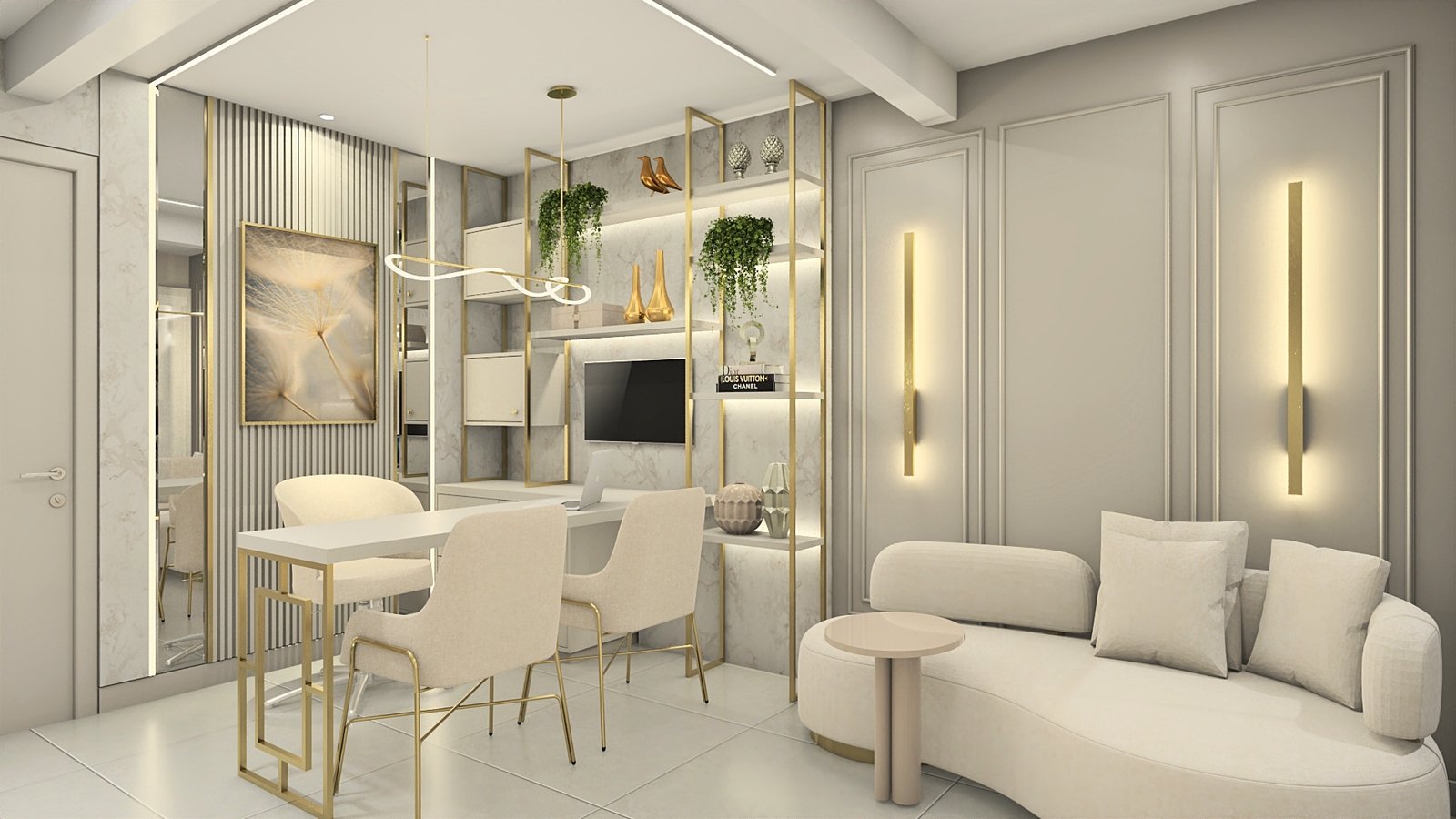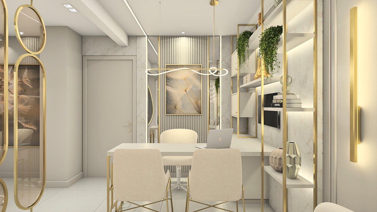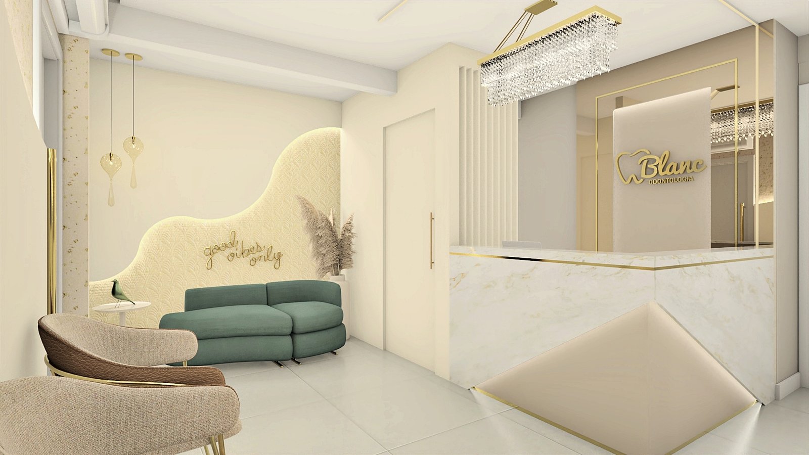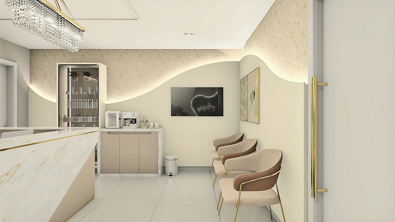 A cliente apresentou como desejo uma clínica clean e sofisticada, sem exageros. Então, partindo desse princípio, criou-se um espaço leve, aconchegante e muito receptivo, através de tons neutros, iluminação de destaque com fita de led em pontos estratégicos para evidenciarmos alguns elementos, e metais dourados para trazer o requinte que foi solicitado. Na recepção foram adotadas as formas curvas em vários pontos, a fim de trazer leveza e transformar esse ambiente de espera em um lugar que transmite tranquilidade. Um cantinho instagramável foi elaborado a pedido da cliente, com um lindo sofá verde para conferir cor com elegância à composição. Dentro do consultório, temos uma atmosfera leve através das cores e acabamentos utilizados. Acima da cadeira odontológica, a tela tensionada promove uma iluminação difusa, clara e confortável aos olhos. Destaque para as divisórias em metal dourado e vidro reflecta que delimitam os espaços. Temos então, um lindo espaço, próprio para receber seus pacientes da melhor forma possível.